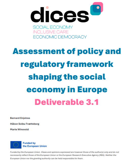 As part of our goal to tackle social exclusion across Europe, the DICES consortium has prepared a new working paper, Assessment of Policy and Regulatory Framework Shaping the Social Economy in Europe, authored by Bernard Enjolras, Håkon Solbu Trætteberg, and Marte Winsvold from the Institute for Social Research. The paper examines how different welfare regimes, national policies, and EU-level initiatives affect the opportunities and constraints faced by social economy actors in care provision.
